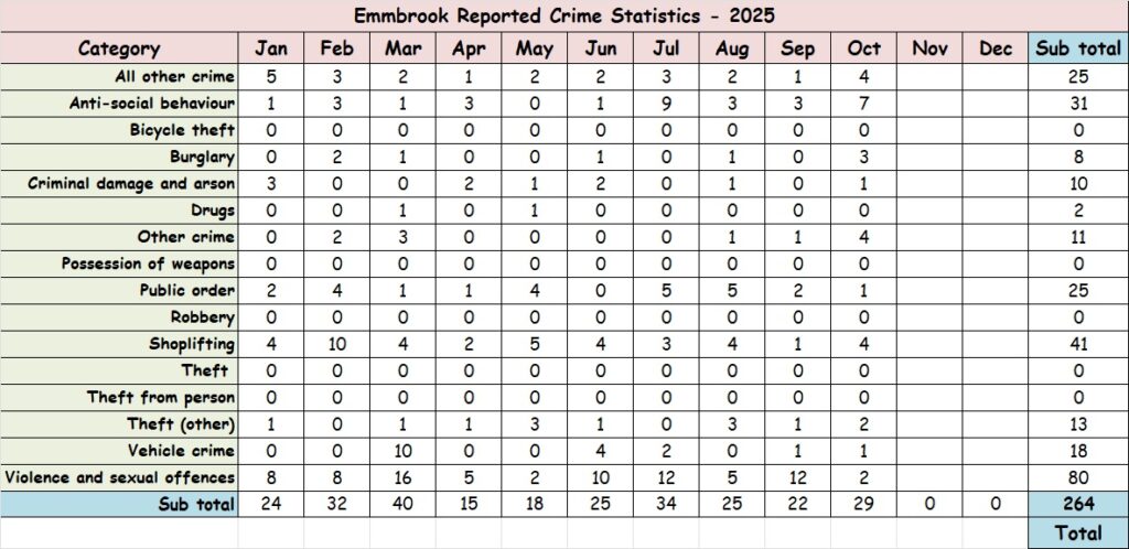 Emmbrook is part of the Winnersh Neighbourhood Policing Area, which also includes Woosehill. Monthly statistics are summarised below, but more detailed information, including location maps showing approximate location of reported crimes and further detail about the Neighbourhood Policing team can be seen here.